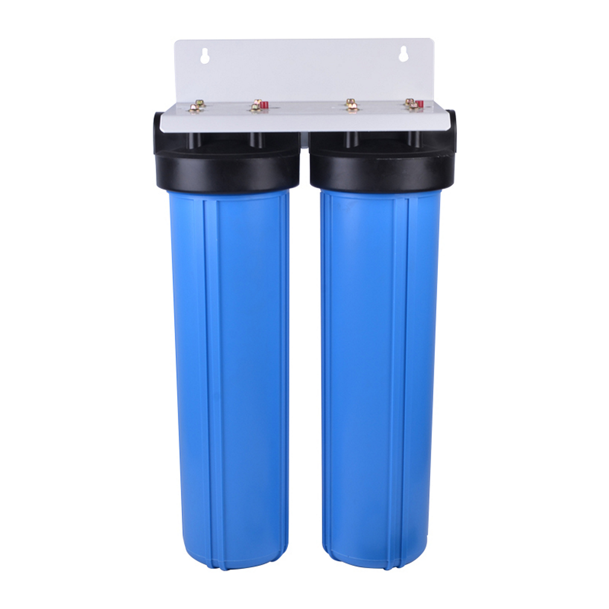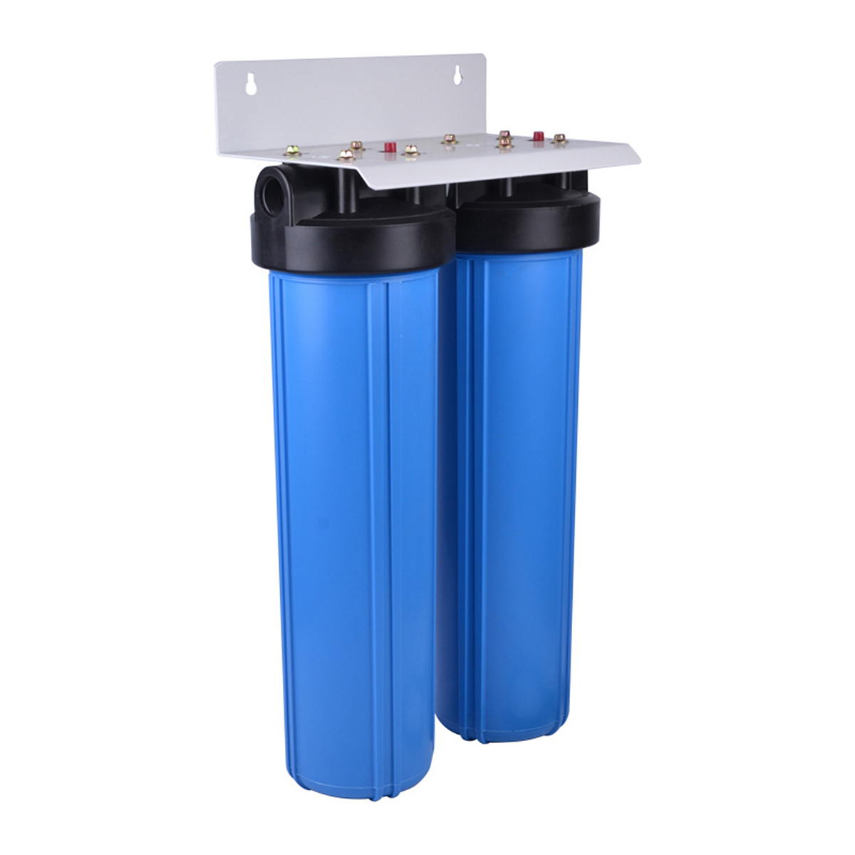 Διπλό φίλτρο κλειστού τύπου Big Blue 20″ με βάση στήριξης κατάλληλο για εξωτερικούς χώρους, διαθέτει κουμπί αυτόματου ξεπλύματος. Αποτελεί μέρος συστήματος για προφίλτρανση τους νερού.